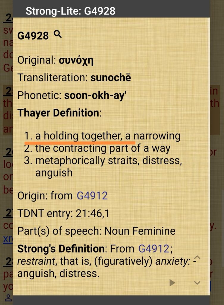 Note the word distress, from Thayer Definition means “a holding together” – συνόχηsunochē Phonetic: soon-okh’-ay